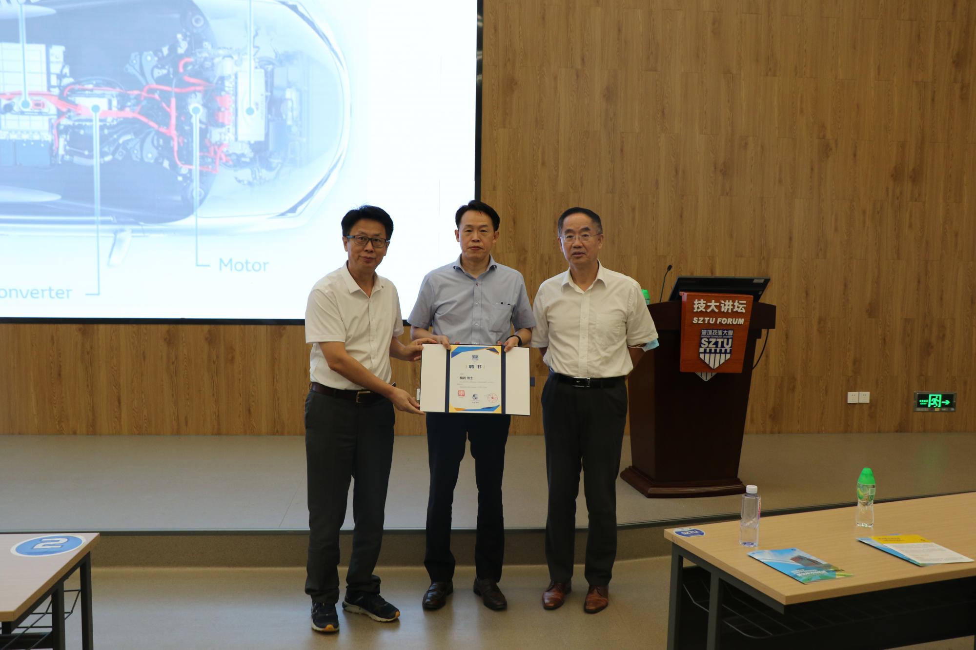 报告结束后,同学老师们向梅博士热烈提问,梅博士给予了风趣幽默又有技术含量的解答。如,锂电池和氢燃料电池汽车出车祸,碰撞后的安全性哪个更优,梅博士表示“Fuel cell is better”——因为它的储氢罐与发电系统分离,氢气罐可以防弹,不怕碰撞,氢气挥发极快,而锂电池汽车含能材料和能量转换部分密堆积在一个有限空间,瞬间起火燃爆速度极快。所以,燃料电池汽车更安全。最后,聚龙学院刘清侠院长以及新材料与新能源学院韩培刚院长给梅博士颁发了“