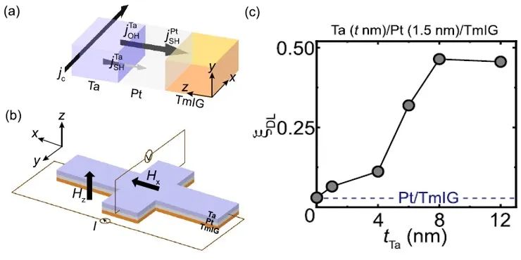 (c) SOT产生效率随Ta层厚度变化图。