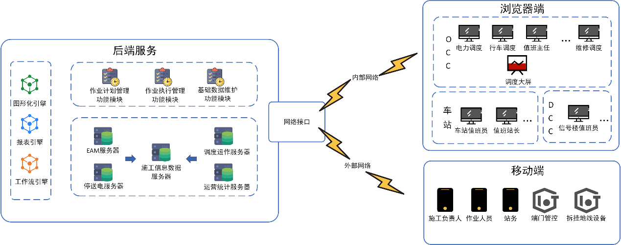 该平台是针对地铁运营施工系统信息化程度滞后、施工资源分配不合理、依赖人为判断、缺乏统一标准等痛点问题进行的创新性研发。平台部署于各OCC、DCC和车站,支持线网级规模,并预留拓展空间,覆盖七大主要模块,拥有47个业务功能页面和15个系统维护功能页面。该平台可实现各角色权限分配,满足各级单位、各岗位的使用需求,实现施工作业全流程的覆盖。