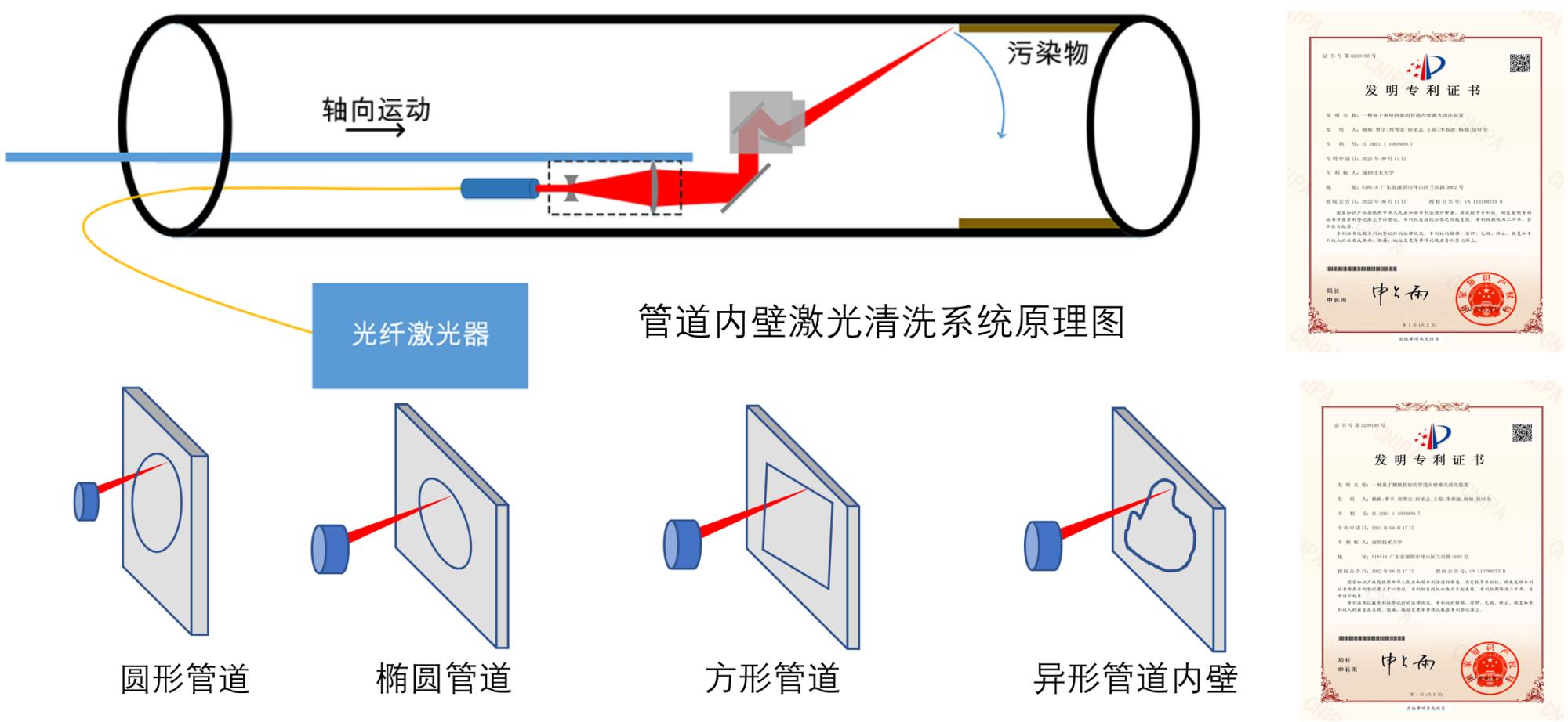 该系统针对已有激光清洗技术的不足,提供了一种用于多尺寸内径管道内壁的清洗技术,采用新颖的基于前聚焦振镜系统的管道内表面激光清洗技术,结合锥反镜将激光焦平面转换成为沿管道内侧的环形面,巧妙地将三维曲面加工分解成二维扫描,解决了如何对复杂曲面进行分解加工的难题,通过外部平台驱动激光扫描头纵向运动,实现沿管道纵深处的逐层环形扫描。该技术完全摒弃了传统三维加工的思路,简化加工过程,解决了传统激光清洗技术难以应用于管道内表面清洗的瓶颈难题。