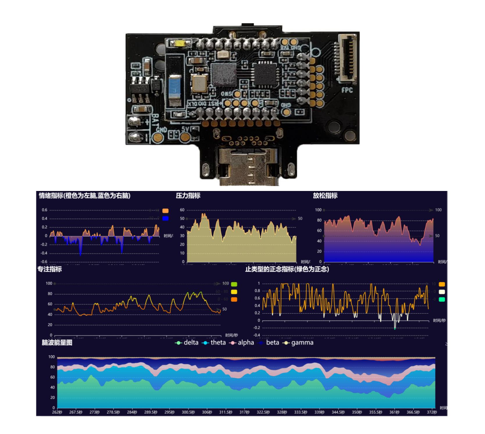 基于柔性金属干电极开发的前额脑电应用方案,集成包括双路高精度EEG信号传感、低功耗蓝牙处理器MCU、锂电池充放电管理以及柔性金属干电极。通过高能效嵌入式脑电信号处理和特征分析算法,实现前额-金属电极高精度脑电波采集,并通过蓝牙实时输出脑电α、β、γ、 δ、 θ波谱,及量化的脑电分析指标如专注力、情绪、冥想、压力和放松度等。有别于传统的脑电方案,无需导联线和导电胶,通过金属干电极直接获取高精度前额脑电信号。方案总体尺寸约2cm*3.5cm,具有高精度、低功耗、小尺寸、易穿戴等特点。