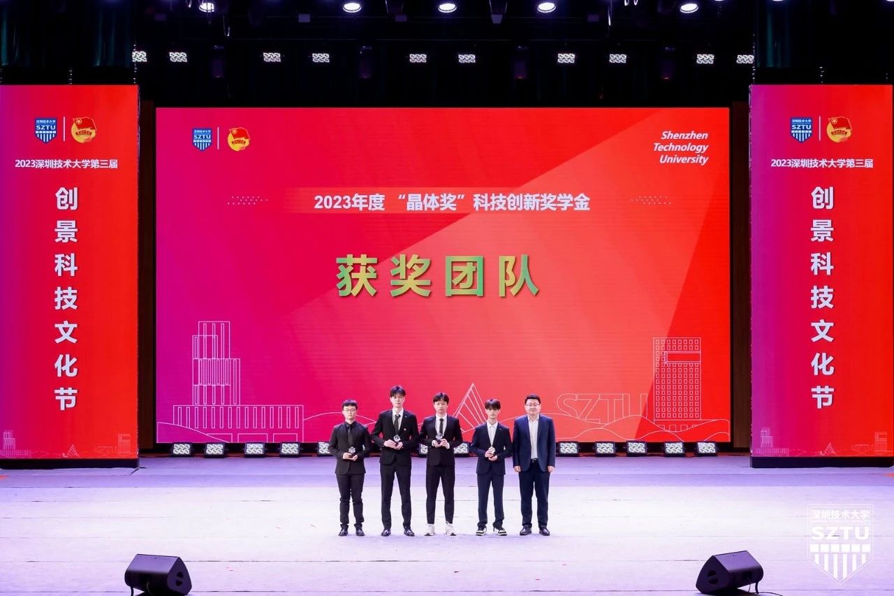 校团委副书记尚莹莹宣读2023年“晶体奖”科技创新奖学金表彰决定,颁奖嘉宾为获奖的4个学生团队颁发奖杯。