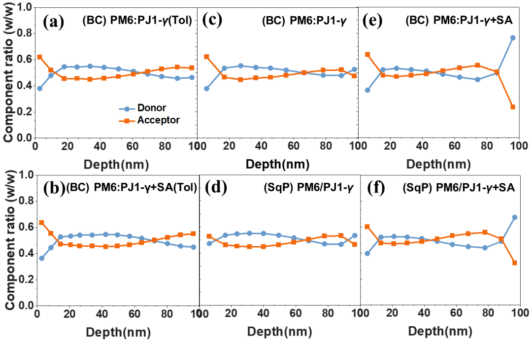 实验结果显示,相比于对照组,固体添加剂的加入能够有效地调控给/受体在垂直方向上的相分离尺度,使得在活性层的底部(靠近空穴传输层处)呈现出更高的电子给体浓度和更低的电子受体浓度。这有助于提高界面的选择性,延长载流子寿命,减少表面复合和载流子被提取的时间,并提高电子迁移率,从而使电子/空穴传输更加平衡高效。