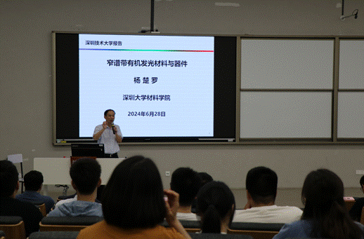 2024年6月28日,“技大讲坛”第八十一讲在C-5公共教学楼108报告厅举行,本次讲坛邀请到国家杰出青年基金获得者、深圳大学讲席教授杨楚罗博士及其团队,讲座题目为:窄光谱有机发光材料及其电致发光器件。新材料与新能源学院张光烨副教授主持了本次讲坛。