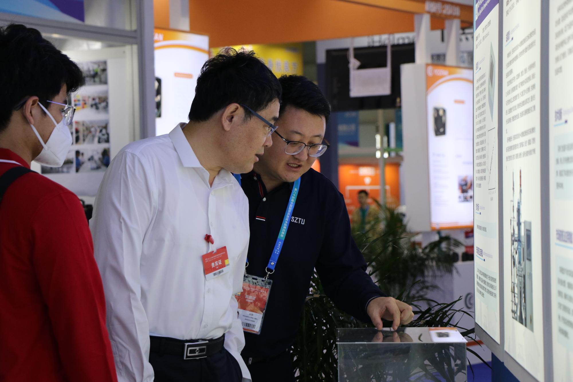 校长阮双琛来到学校展位,逐一观摩学校参展项目成果,仔细询问项目研究现状、技术创新亮点及应用情况,他鼓励科研人员再接再厉,加快科研成果产业化,对学校高新技术成果转化与应用提出了更高的要求。