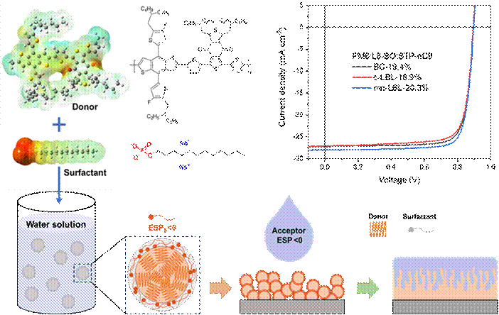 本研究中独创了一种突破性的水系加工策略,通过创新的逐层(LBL)制备方法成功克服了高效有机太阳能电池的厚度限制。通过工程化含有战略设计表面活性剂的水系纳米颗粒电子给体墨水,实现了对给体-受体相互扩散和垂直相分布的卓越控制。DFT计算表明,阴离子表面活性剂,特别是双电荷的SDP分子,为增强给体-受体相互作用创造了最佳的静电势梯度。EPR和UPS结果证实,阴离子表面活性剂同时实现了给体基质的p型掺杂和界面能量学的改善。形貌研究技术揭示,水基逐次沉积加工的厚膜活性层中垂直相分离的缓解和高结晶度的形成。优化的形貌导致厚膜OSC中有效的载流子分离和传输。采用含表面活性剂SDP的水系给体PM6和非卤化甲苯的受体L8-BO溶液处理的二元体系实现了接近20%的能量转换效率(PCE)。基于SDP加工的逐次沉积OSCs表现出最佳的厚度耐受性,在300和400 nm厚度下分别实现了18.9%和17.3%的PCE。此外,将SDP逐次沉积策略应用于三元PM6:L8-BO:BTP-eC9系统获得了20.3%(认证效率19.9%)的出色PCE。通过静电和掺杂效应的基础理解所展示的性能指标,为环境友好型OSC制造设立了新基准,同时为未来器件优化提供了通用平台。