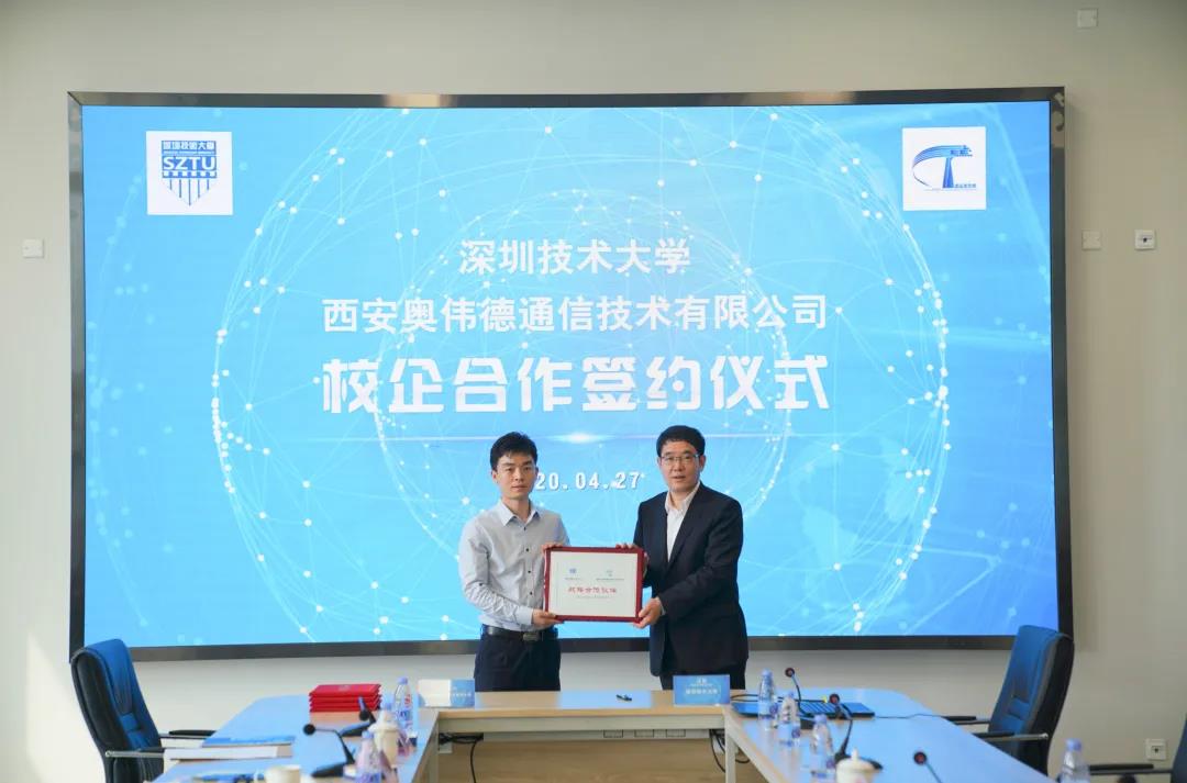 与西安奥伟德通信技术有限公司校企合作签约仪式通过视频在我校与西安同步举行。校长阮双琛出席深圳现场签约仪式,西安市雁塔区区委副书记、区长赵雷,西安市科学技术局副局长楼晓文,西安市雁塔区政府办公室主任焦鸣军,西安市雁塔区科技和工业信息化局局长薛瑛,西安奥伟德通信技术有限公司董事长杨西兵等在西安通过视频参加签约仪式。