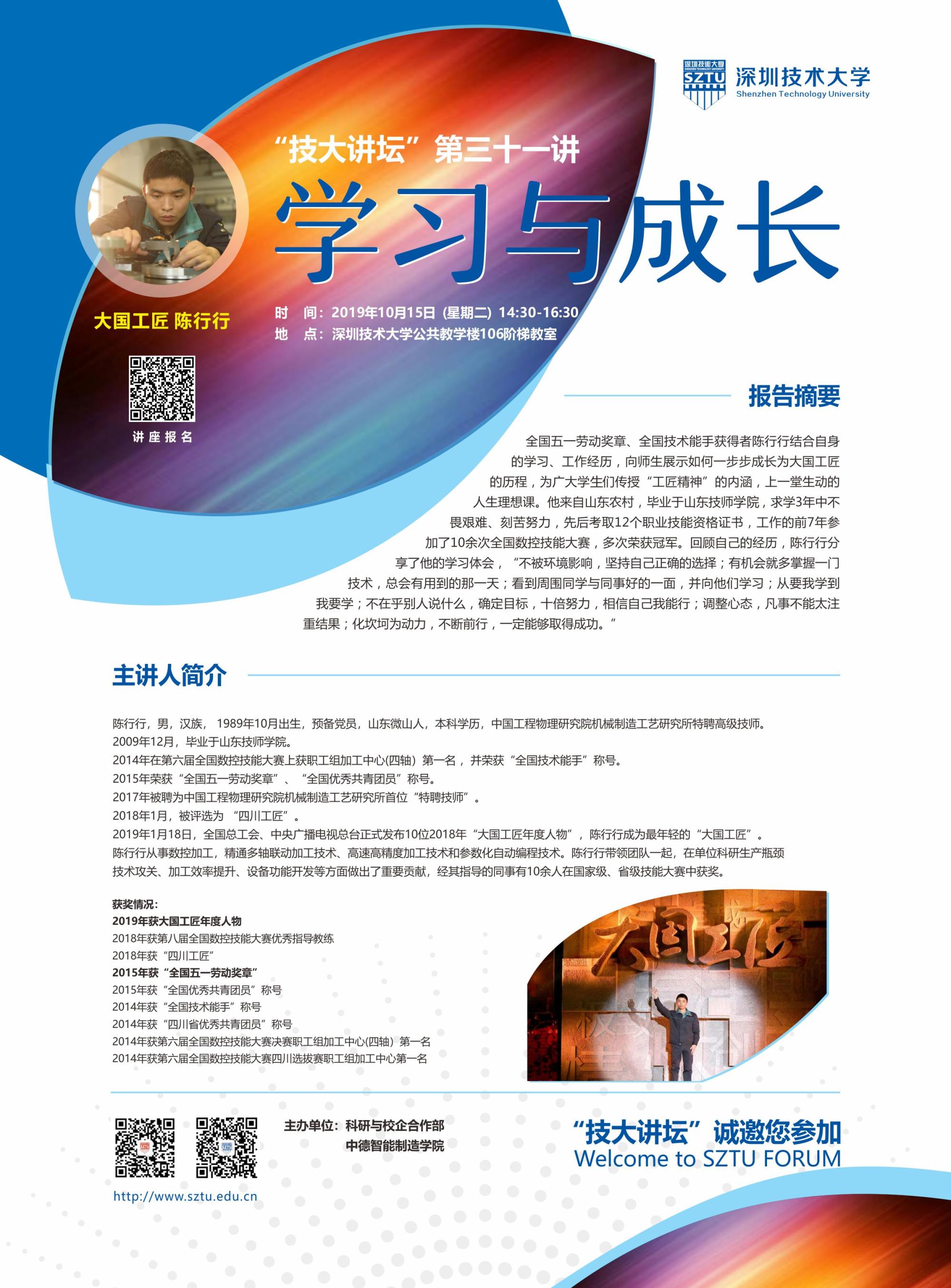 全国五一劳动奖章、全国技术能手获得者陈行行结合自身的学习、工作经历,向师生展示如何一步步成长为大国工匠的历程,为广大学生们传授“工匠精神”的内涵,上一堂生动的人生理想课。他来自山东农村,毕业于山东技师学院,求学3年中不畏艰难、刻苦努力,先后考取12个职业技能资格证书,工作的前7年参加了10余次全国数控技能大赛,多次荣获冠军。回顾自己的经历,陈行行分享了他的学习体会,“不被环境影响,坚持自己正确的选择;有机会就多掌握一门技术,总会有用到的那一天;看到周围同学与同事好的一面,并向他们学习;从要我学到我要学;不在乎别人说什么,确定目标,十倍努力,相信自己我能行;调整心态,凡事不能太注重结果;化坎坷为动力,不断前行,一定能够取得成功。”