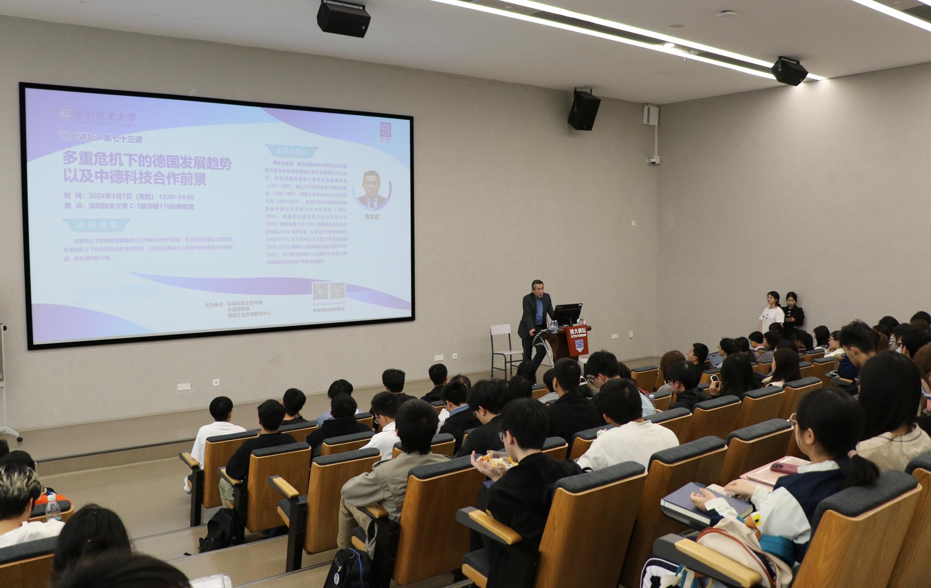 ,举办主题为“多重危机下的德国发展趋势以及中德科技合作前景”的讲座。外国语学院院长钟玲教授和众多师生共同聆听了报告。