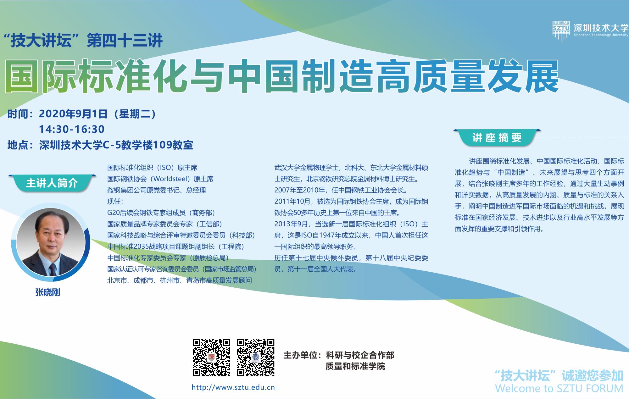 时间:2020年9月1日(星期二)14:30-16:30地点: C-5教学楼109教室主讲人:张晓刚主题:国际标准化与中国制造高质量...