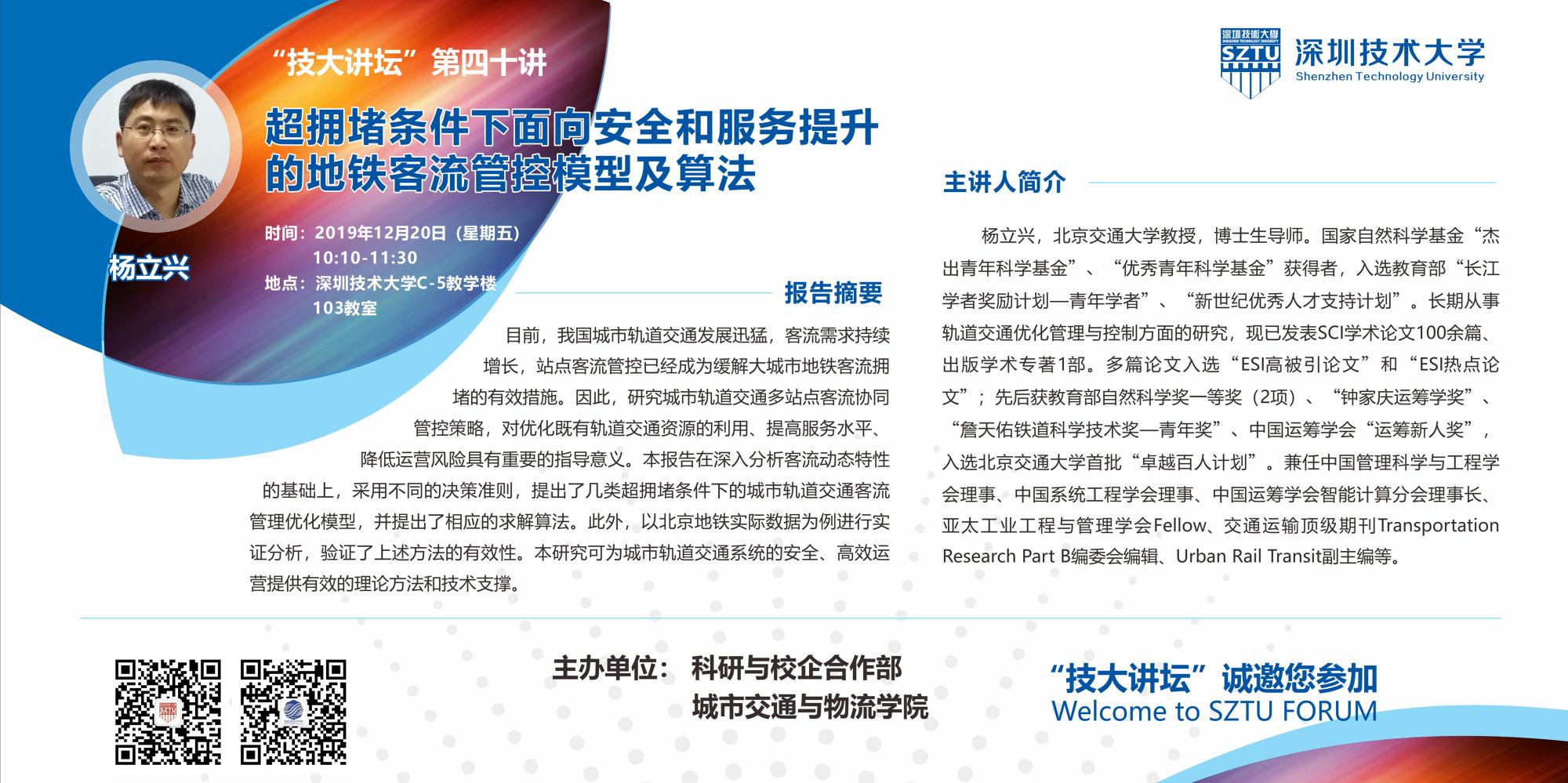 主讲人:杨立兴时间:2019年12月20日(星期五)10:10-11:30地点: C-5教学楼103教室主题:超拥堵条件下面向安全和服务...