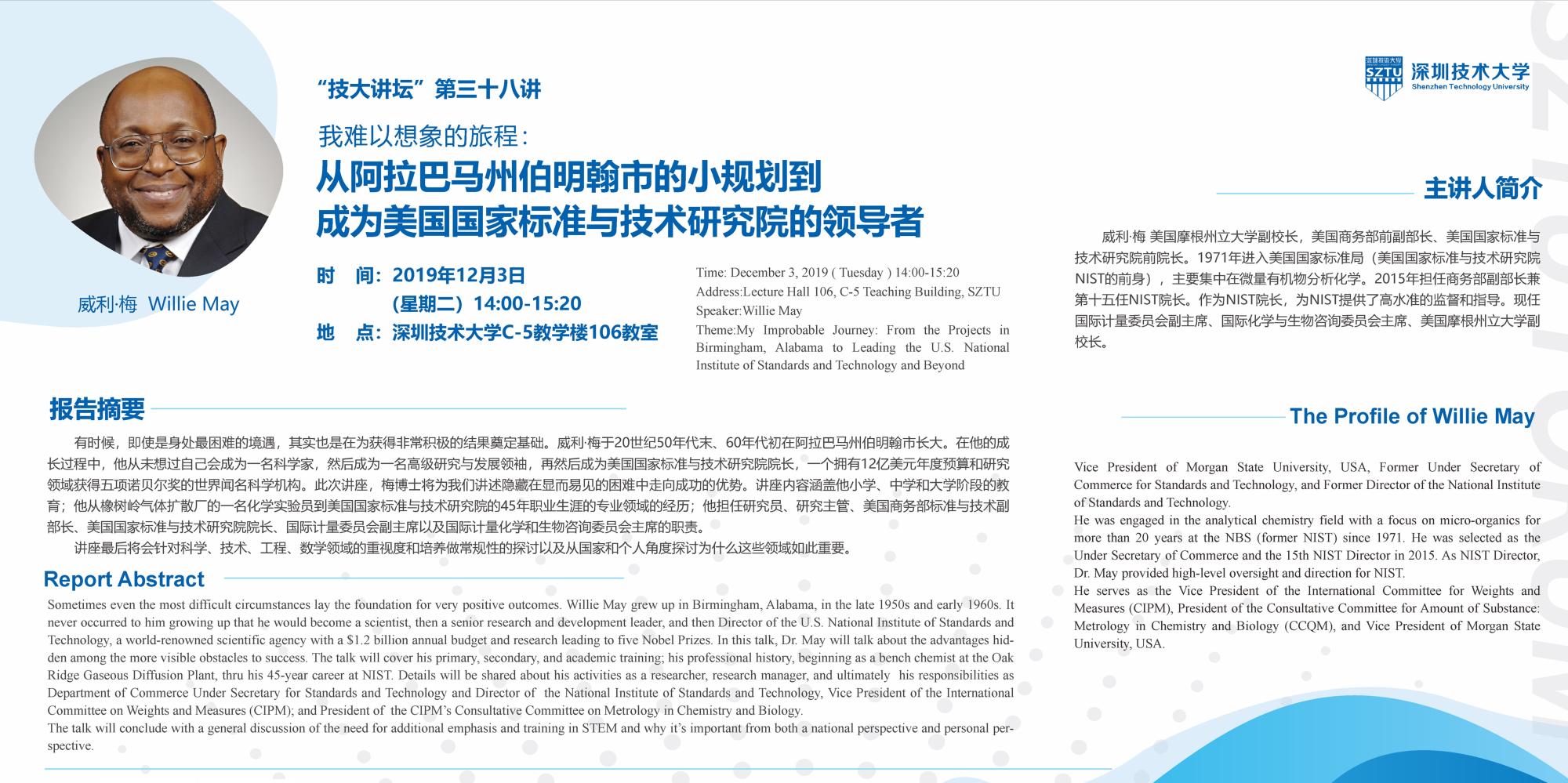 时间:2019年12月3日(星期二)14:00-15:20地点: C-5教学楼106教室主讲人:威利·梅主题:我难以想象的旅程:从阿拉巴...